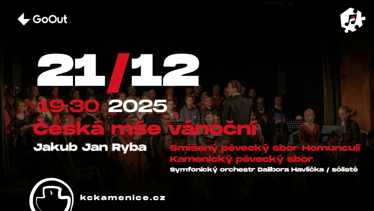 Tradiční představení České mše vánoční Jakuba Jana Ryby, tentokrát v ryze předvánočním termínu. Srdečně zve Kamenický pěvecký sbor pod vedením nového mladého sbormistra Vojtěcha Čapka, Jílovský pěvecký sbor Homunculi to vše za doprovodu Symfonického orchestru Dalibora Havlíčka. Přijďte se společně odpočinout si od předvánočního shonu a naladit se do vánoční atmosféry.